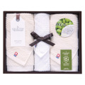 EUの厳しい環境基準をクリアした1000年以上の由緒ある高級なマルセイユソープを使い精錬加工を施したタオルシリーズです。天然植物油のオリーブソープを使用することで化学薬品の使用量を従来より約60%削減。さらに、低温で短時間処理することで、CO2を約50%程度削減することができ、水の使用量を従来より約25%程度削減できました。また、オリーブオイルに含まれるオレイン酸が脂肪酸を補うため、洗浄と潤いの2つの効果を発揮します。無漂白のタオルと蛍光増白剤なしの白タオルは共にSDGsの観点から環境問題を考え、環境負荷を少なくした工程でできたタオルです。やわらかさをそのままに抜群の吸水力を発揮する今治タオル認定の環境と健康を考えたギフトセットです。無漂白のタオルはエコマーク認定商品です。